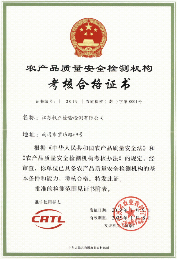 江蘇權正獲得農產品質量安全檢測機構資質證書(CATL)
