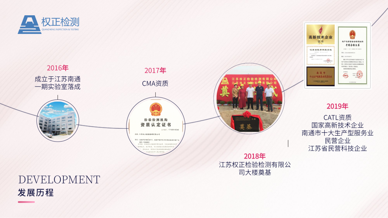 2017年4月22日,剛滿周歲的江蘇權(quán)正迎來了江蘇省檢驗(yàn)檢測機(jī)構(gòu)資質(zhì)認(rèn)定現(xiàn)場評審,并順利取得CMA資質(zhì)認(rèn)定證書。2018年9月30日,江蘇權(quán)正檢驗(yàn)檢測有限公司大樓奠基。2018年12月,江蘇權(quán)正再次接受農(nóng)產(chǎn)品質(zhì)量安全檢測機(jī)構(gòu)考核現(xiàn)場評審,并于3周歲前獲取了CATL資質(zhì)認(rèn)定證書。一年后,江蘇權(quán)正順利通過國家高新技術(shù)企業(yè)認(rèn)定,被評為南通市十大生產(chǎn)型服務(wù)業(yè)名營企業(yè)、江蘇省民營科技企業(yè)。
